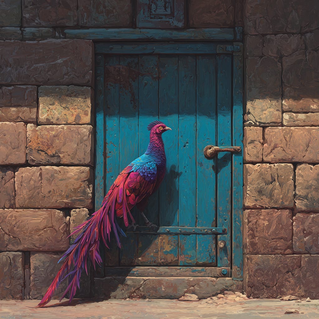 The bird strutted around the counter toward me, then fluttered to the back of the booth. He peered at me with one eye while using one claw to clean bits of crumb away from his beak. His shimmering tail was about half the length of a peacock’s tail, and his body was covered with burnished dull red feathers over charcoal-gray down. “What is he? I’ve never seen anything quite like him before.”